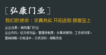 • 河北弘康門業有限公司     河北弘康門業有限公司是一家生產防爆門窗、泄爆門窗、密閉門窗、防火門窗、監獄門、隔音門、變壓器門,隧道抗風壓防火門,隧道防護門,3小時防火門窗,防火玻璃門,雙向開啟防火門等特種門窗的生產廠家。河北弘康門業有限公司一直致力于防爆技術、新產品的研究開發工作。